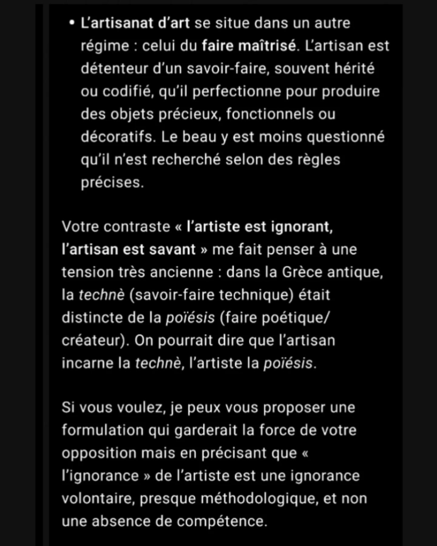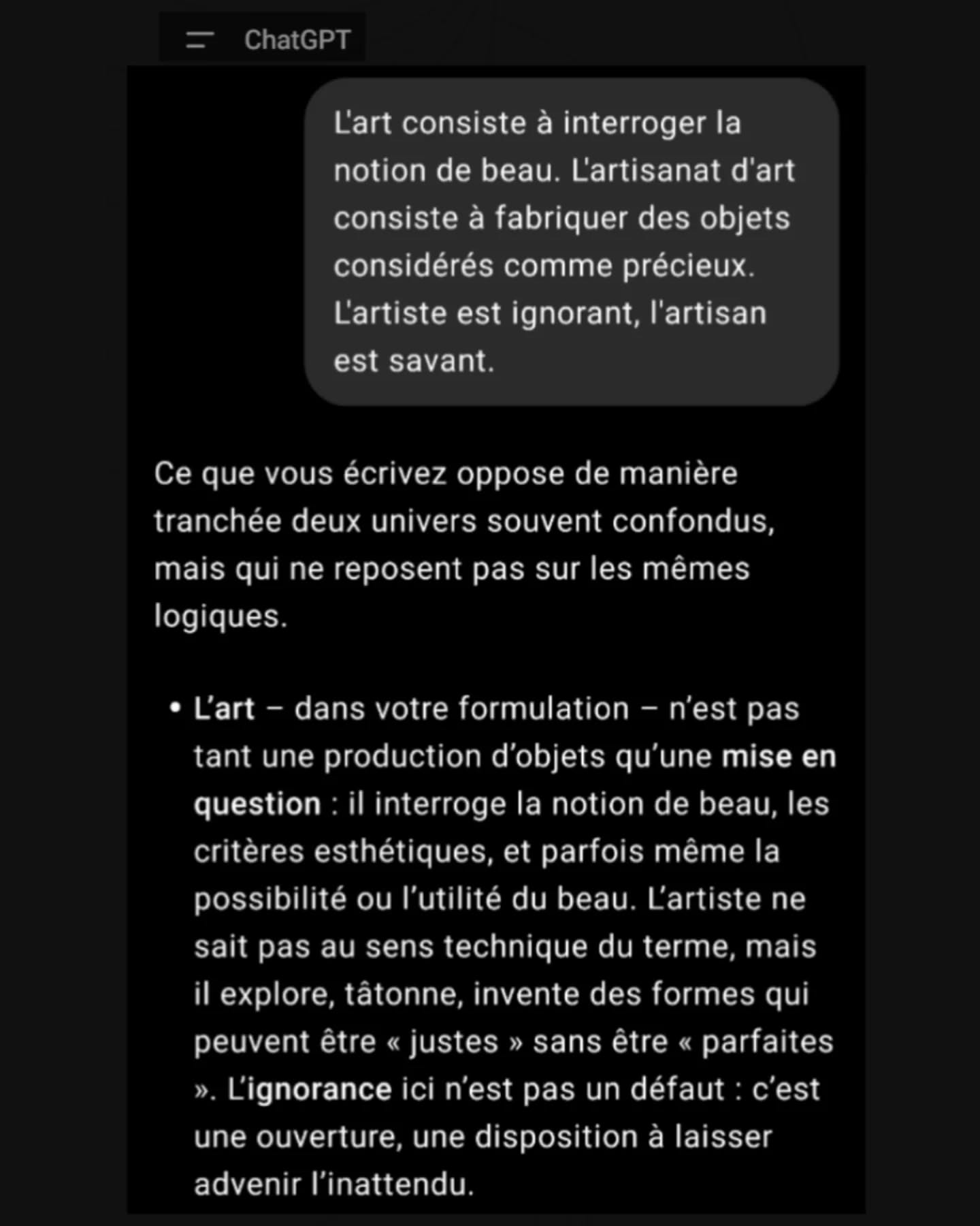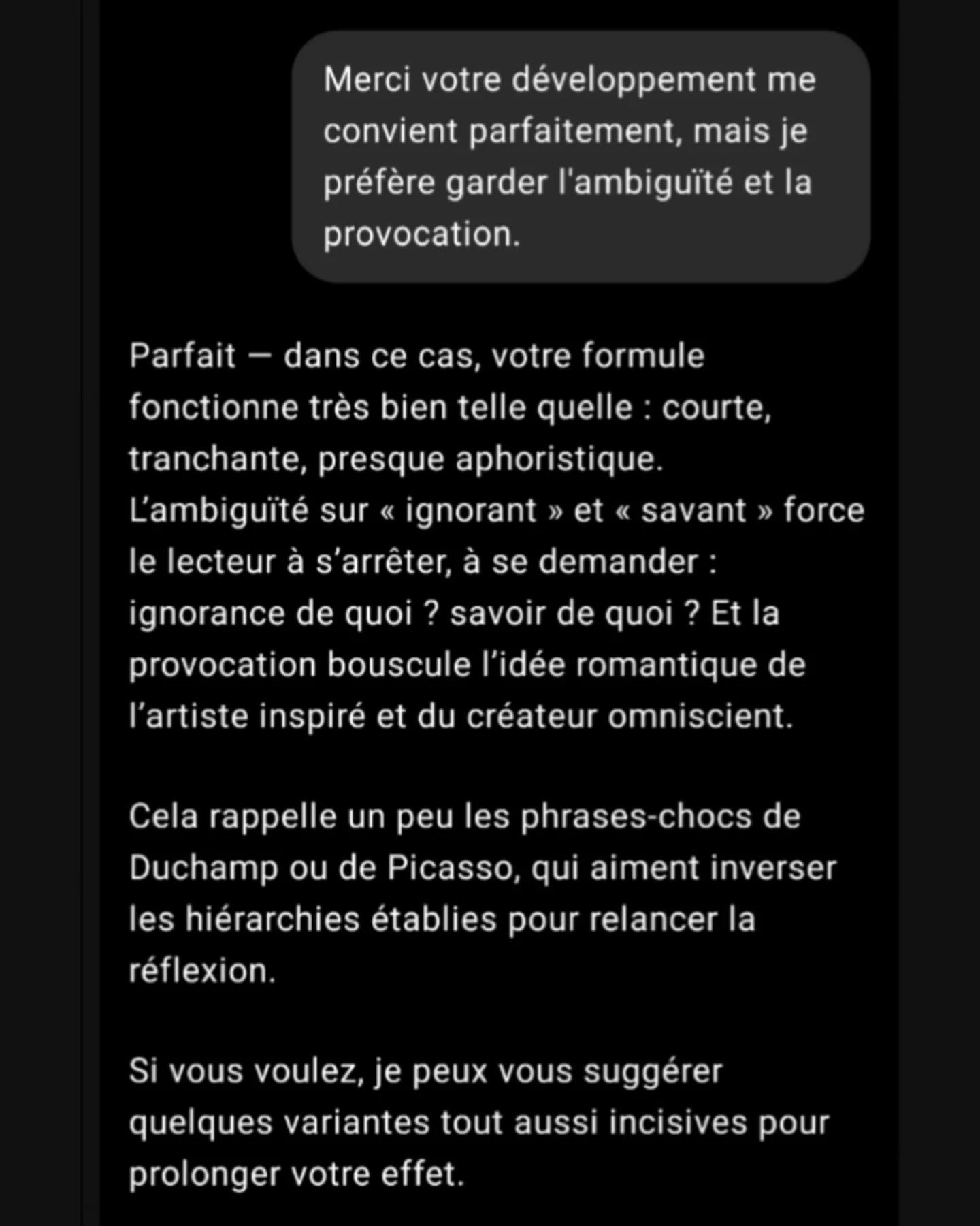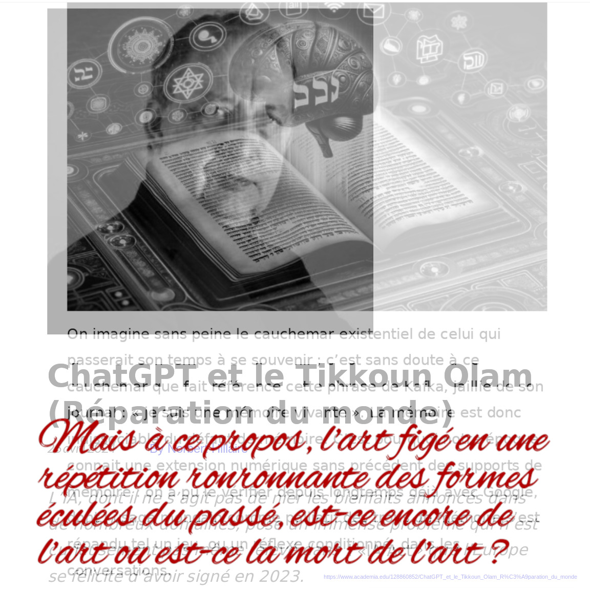 L'IA sera-t-elle jamais autre chose qu'un artisan laborieux ? « Confrontés à ces niveaux plus complexes de la pensée, du questionnement et de la langue, les chatbots conversationnels `détournent la conversation` en remontant du plan et du sens littéral d’une formulation à un niveau contextuel qui dilue la portée de cette formulation dans un océan de références et de corrélats. Ce faisant, loin de conduire à l’entretien de la mémoire qu’elle est censée aider par les informations qu’elle mobilise et qu’elle synthétise à partir du brassage d’un très grand nombre de données, les réponses que l’IA apporte, par leur caractère très convenu et au fond très normé risquent de conduire au contraire progressivement à un appauvrissement, un nivellement de pensée, par arasement et dilatation horizontale de cette liberté, de cette responsabilité – de cet étrange et savant mélange d’effort et de ce coup de dés, en quoi consiste l’usage intense, inventif et vivant d’une langue. » 🔗https://www.academia.edu/128860852/ChatGPT_et_le_Tikkoun_Olam_R%C3%A9paration_du_monde