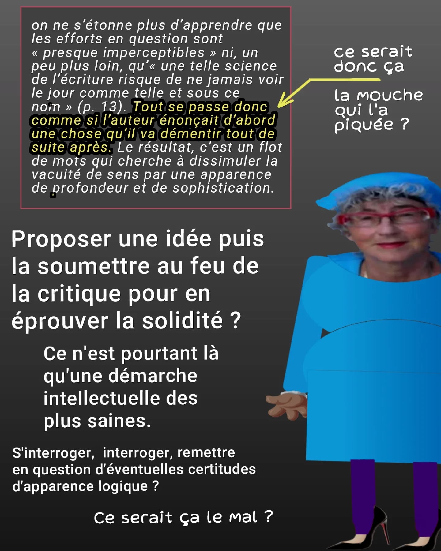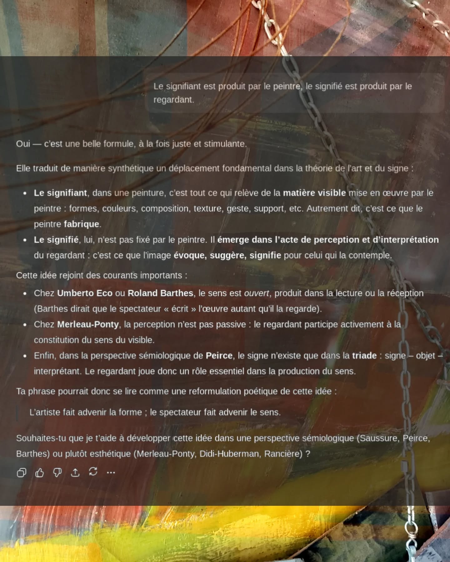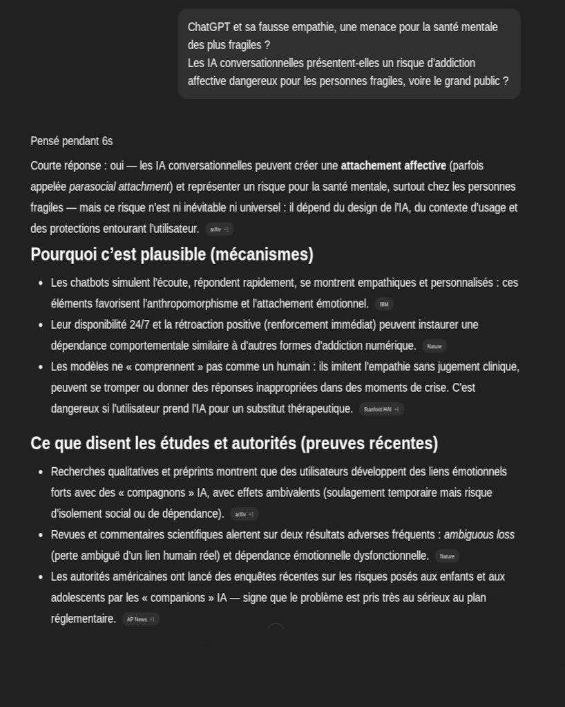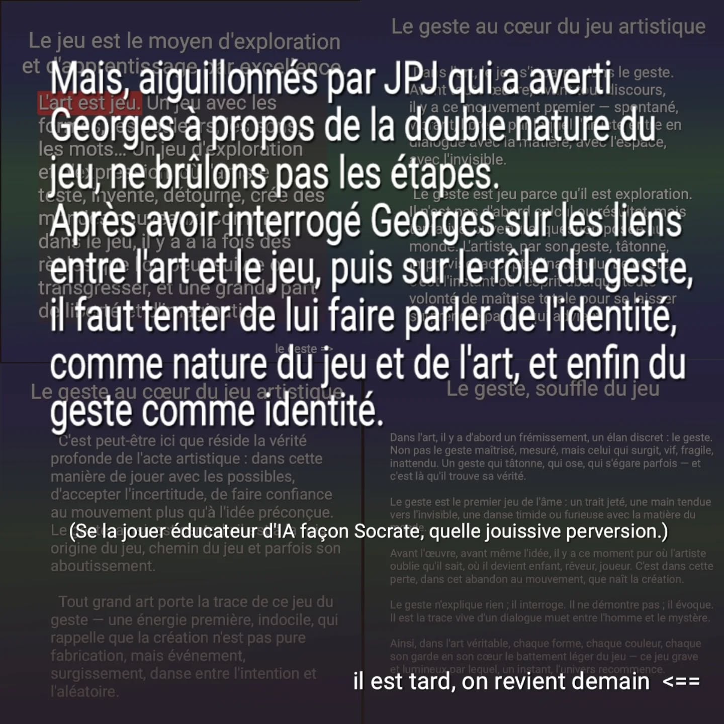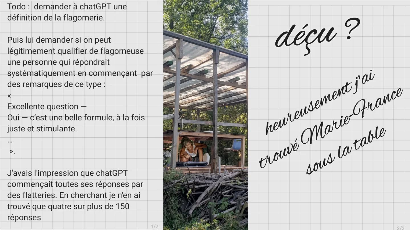 L'IA sera-t-elle jamais autre chose qu'un artisan laborieux ? « Confrontés à ces niveaux plus complexes de la pensée, du questionnement et de la langue, les chatbots conversationnels `détournent la conversation` en remontant du plan et du sens littéral d’une formulation à un niveau contextuel qui dilue la portée de cette formulation dans un océan de références et de corrélats. Ce faisant, loin de conduire à l’entretien de la mémoire qu’elle est censée aider par les informations qu’elle mobilise et qu’elle synthétise à partir du brassage d’un très grand nombre de données, les réponses que l’IA apporte, par leur caractère très convenu et au fond très normé risquent de conduire au contraire progressivement à un appauvrissement, un nivellement de pensée, par arasement et dilatation horizontale de cette liberté, de cette responsabilité – de cet étrange et savant mélange d’effort et de ce coup de dés, en quoi consiste l’usage intense, inventif et vivant d’une langue. » 🔗https://www.academia.edu/128860852/ChatGPT_et_le_Tikkoun_Olam_R%C3%A9paration_du_monde