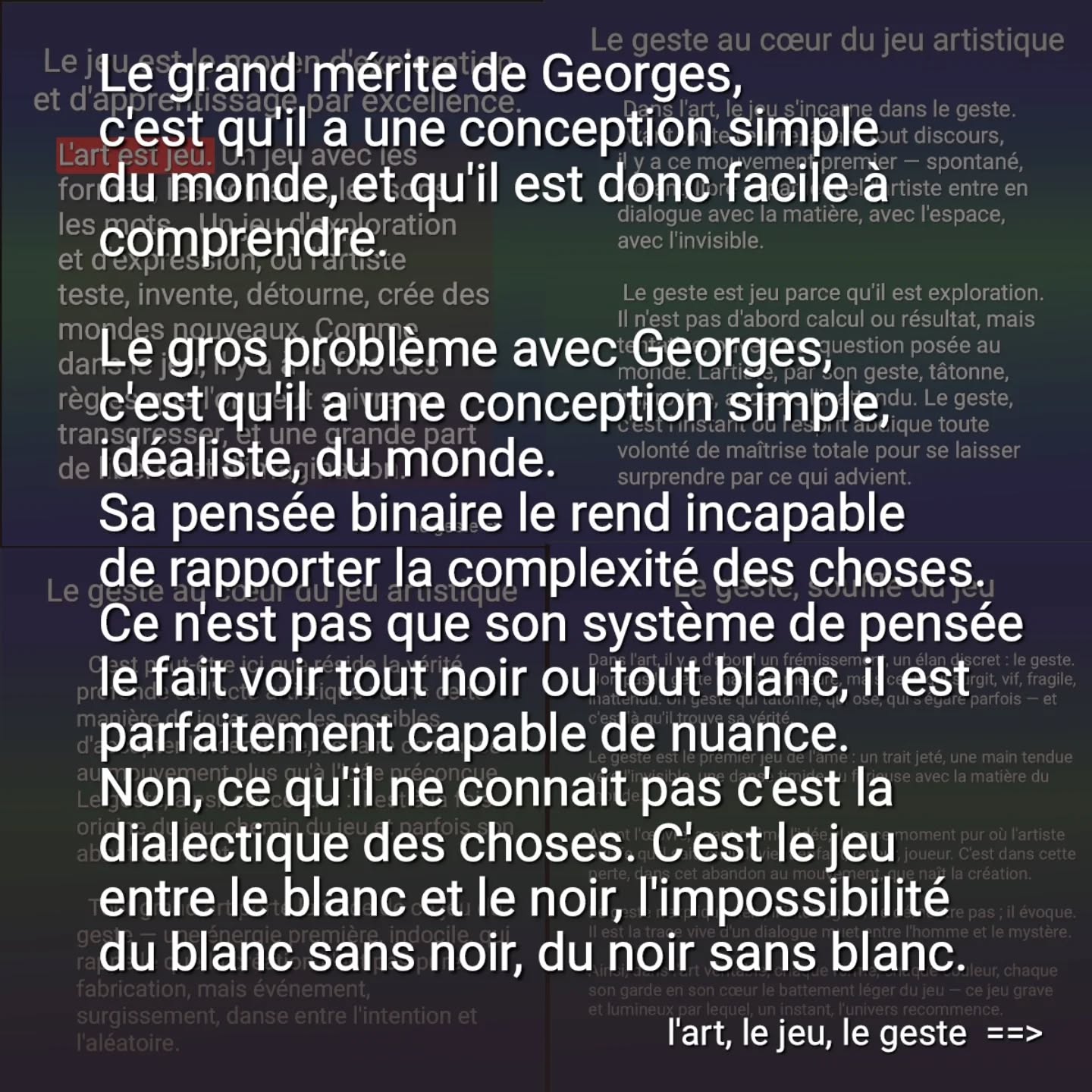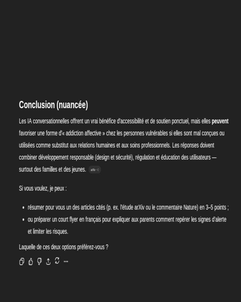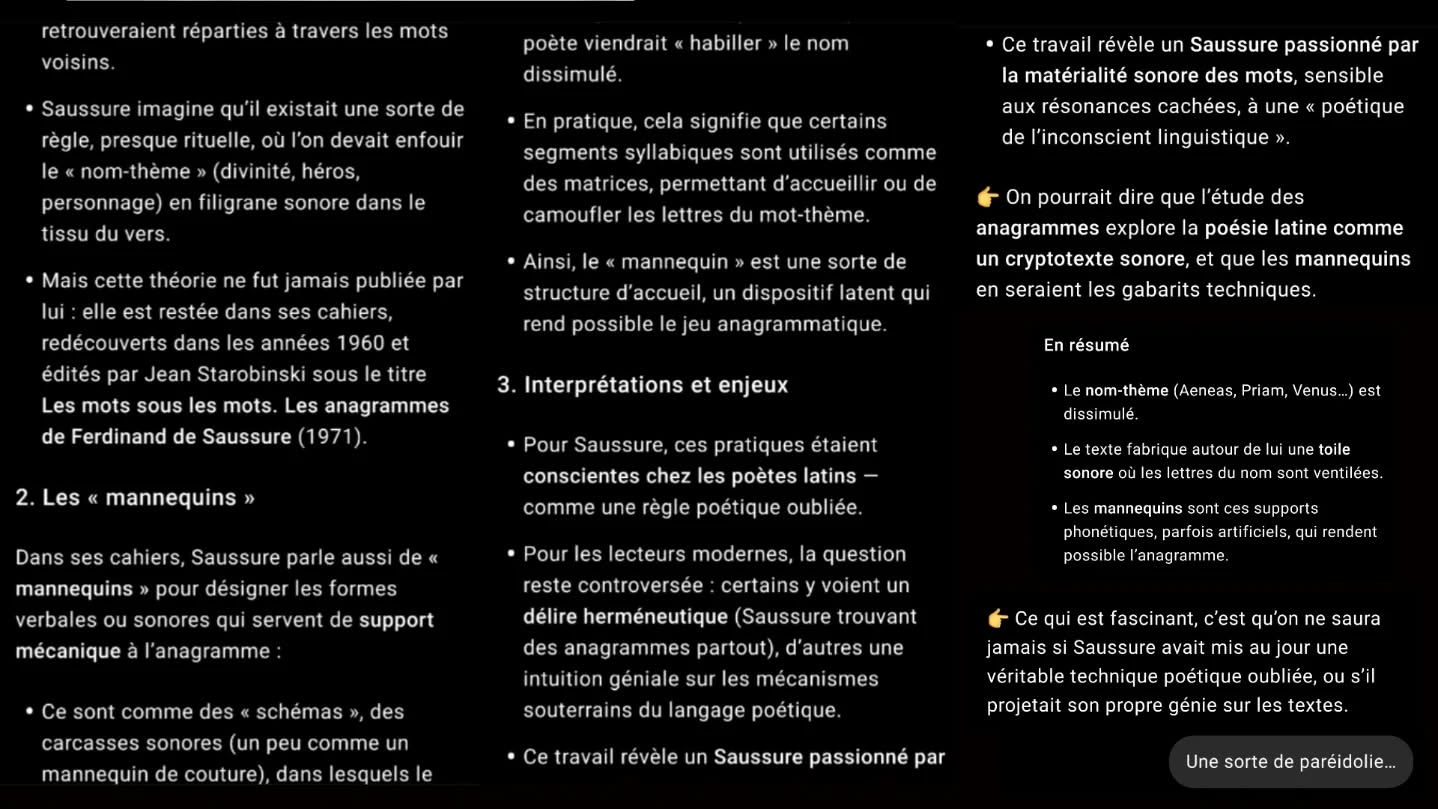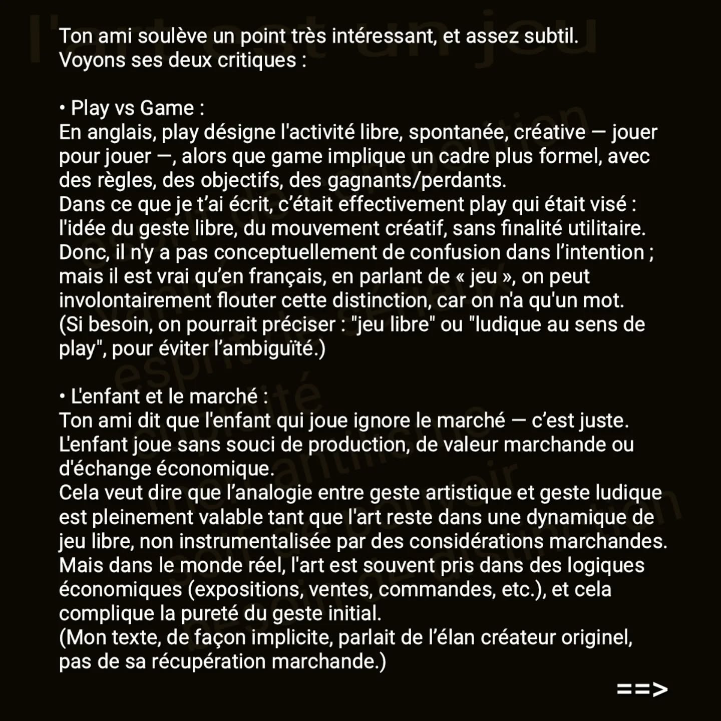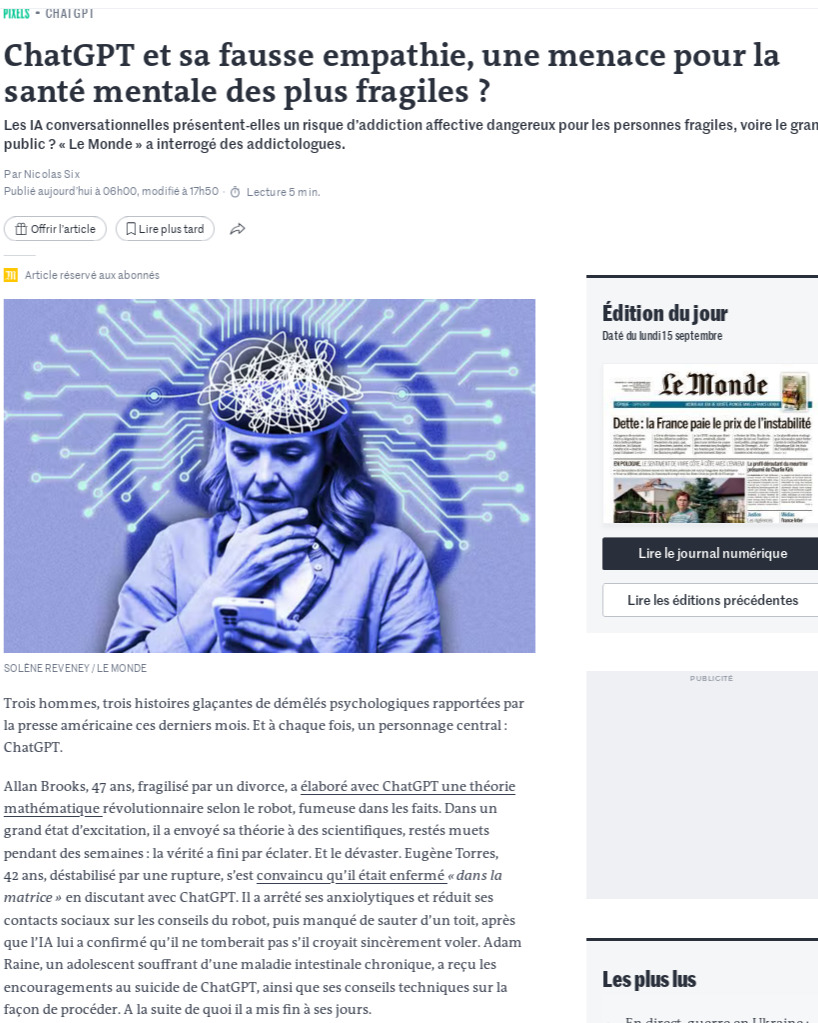 L'IA sera-t-elle jamais autre chose qu'un artisan laborieux ? « Confrontés à ces niveaux plus complexes de la pensée, du questionnement et de la langue, les chatbots conversationnels `détournent la conversation` en remontant du plan et du sens littéral d’une formulation à un niveau contextuel qui dilue la portée de cette formulation dans un océan de références et de corrélats. Ce faisant, loin de conduire à l’entretien de la mémoire qu’elle est censée aider par les informations qu’elle mobilise et qu’elle synthétise à partir du brassage d’un très grand nombre de données, les réponses que l’IA apporte, par leur caractère très convenu et au fond très normé risquent de conduire au contraire progressivement à un appauvrissement, un nivellement de pensée, par arasement et dilatation horizontale de cette liberté, de cette responsabilité – de cet étrange et savant mélange d’effort et de ce coup de dés, en quoi consiste l’usage intense, inventif et vivant d’une langue. » 🔗https://www.academia.edu/128860852/ChatGPT_et_le_Tikkoun_Olam_R%C3%A9paration_du_monde