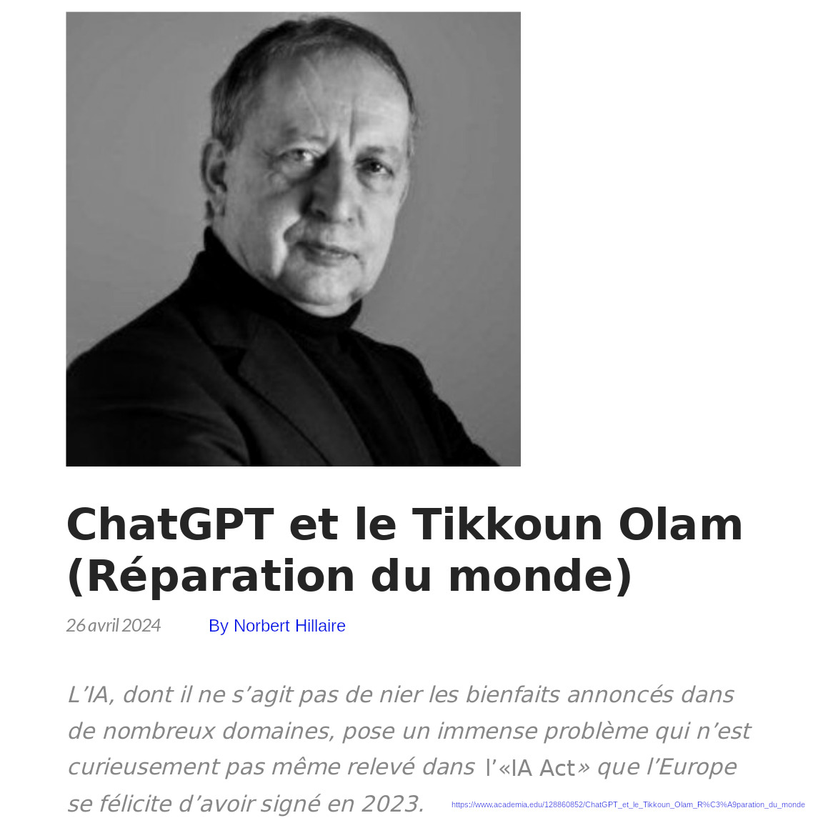 Dans le premier article : 🔗https://www.academia.edu/128860852/ChatGPT_et_le_Tikkoun_Olam_R%C3%A9paration_du_monde on pouvait découvrir, en creux, comment utiliser l'IA avec profit. Norbert Hillaire a fait, ensuite, part de cet article à ChatGPT , et ChatGPT répond, fort justement, du bon usage de ChatGPT : 🔗https://www.academia.edu/128860929/ChatGPT_et_le_Tikkoun_Olam_2_