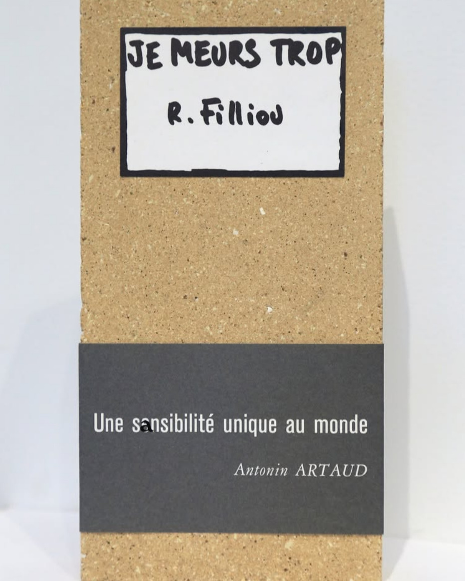 ROBERT FILLIOU Je meurs trop, 1977 Livre-brique, brique de ciment, encre, papier, titrée, signée et numérotée n° /50 au dos 22 x 11 x 3 cm